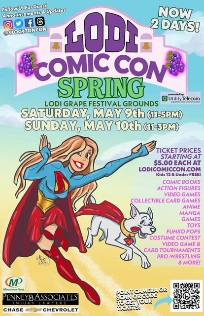 Comic Con is coming to Lodi! ComicCon is a family friendly event featuring a large array of artists, exhibitors, and pop culture fans, with over 200 booths and tables. Think comics, cosplay, collectibles, Funko Pops, gaming, anime, action figures, and celebrity meet-and-greets. Check out the line up of guests here.